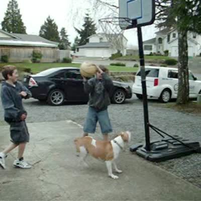 Teen boy does a jump shot playing basketball in driveway. Brown and white dog runs through his legs while he is in the air, he falls down.