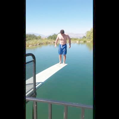 Teen boy in a Speedo practices diving, he does a backflip dive off the board and belly flops. Short clip, no tails.