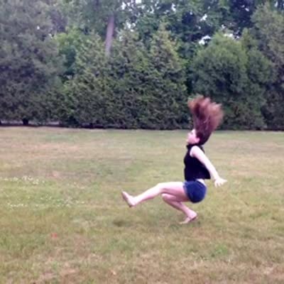 A teen girl bends over backwards in a park outdoors and picks up a ball and throws it up in the air. She loses her balance and falls and then the ball comes back down and hits her in the face.