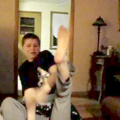 A young boy dances around on his sister while she kicks her legs under him like they're his legs. She accidentally kicks him in the face.