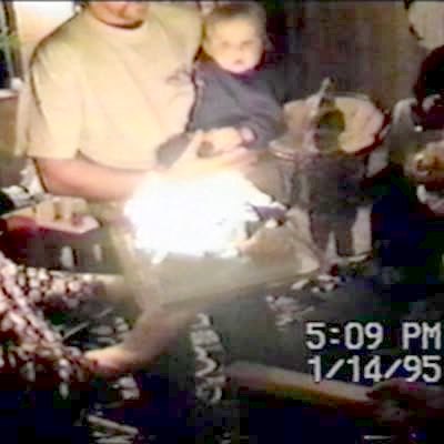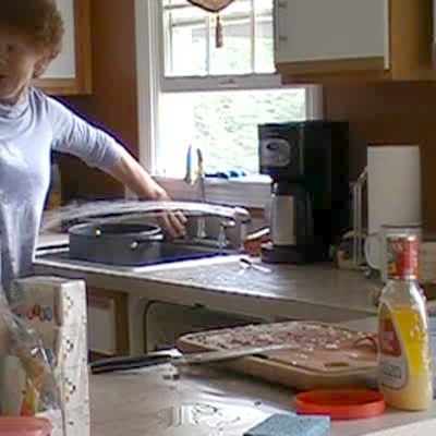 A senior woman stands in a kitchen with her back to the camera. A man off camera scares by shouting "Where do you want me to vacuum!?" The woman jerks, turns around and says, "Jesus, Mary, and Joseph! You're gonna get killed, I'm telling you. You do that again..." The woman throws a jar at the man but misses.
