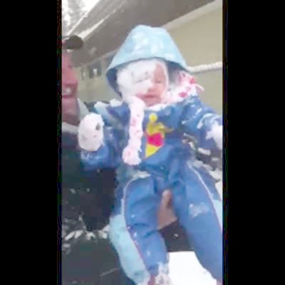 A man sets a tot girl in a snow covered bush outdoors and she sinks down inside of it.