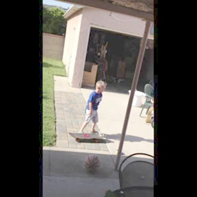 A little boy jumps on his skateboard to try and launch a bottle into the air. At 0:16, he hits himself in face with board on accident.