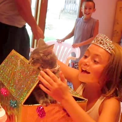 A young girl is scared when a kitten pops out of one of her birthday presents, but is quickly excited when she sees what it is indoors.