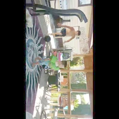 A senior man falls over on a slip and slide outdoors and lies flat.
