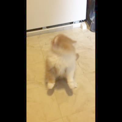 A kitten sneezes repeatedly for 7 seconds and a piece of food flies out of it in the kitchen indoors.