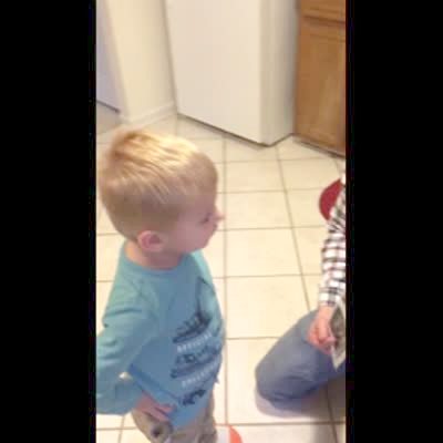 A young boy jumps off a footstool and his chin hits his tot sister in the head in slow motion.