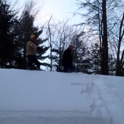 Two men stand on a roof covered in snow and joke about knocking the snow off the roof. The snow breaks and falls off the roof and the two men fall with it.