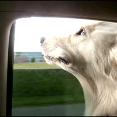 Big dog (looks like golden retriever) rides in a car with its head out of the window.