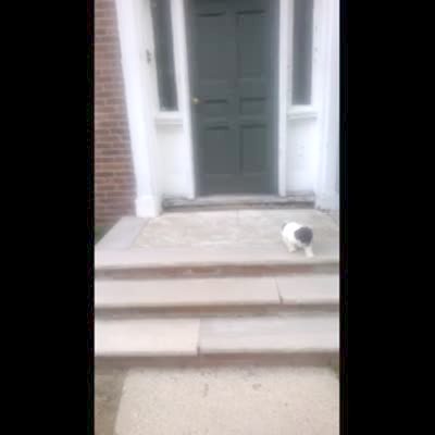 A puppy dog is afraid of the steps on a porch so it jumps in to a bush.
