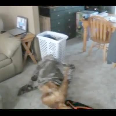 Large brown dog leaps off the couch at a dancing balding man and knocks him down