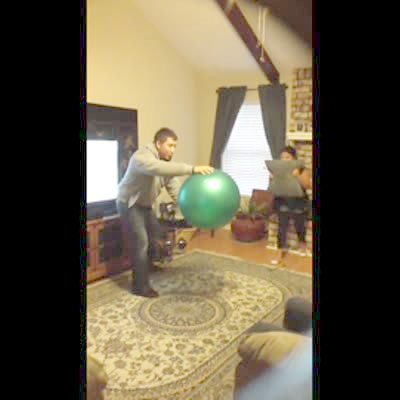 A teen boy jumps on to a treadmill, holding a large exercise yoga ball, and flips into the air.