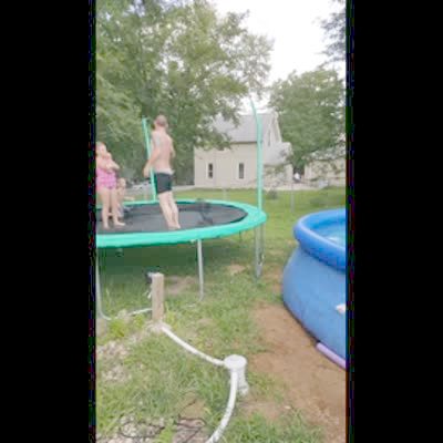 A man tries to flip from a trampoline into a pool and falls onto the side of the pool.