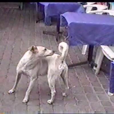 Dog looks at its tail & then suddenly bites it. Silly pet.