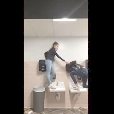 Two teen girls stand on school bathroom sinks to take a picture and one of the sinks breaks.