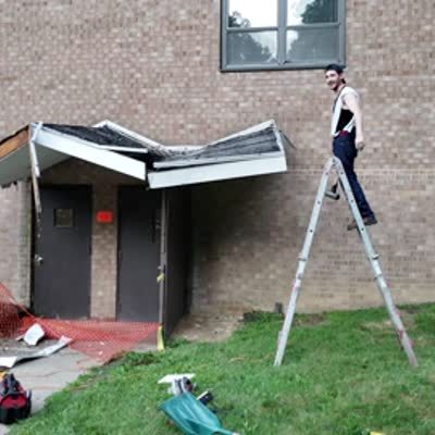 A man breaks down a roof and a piece of it hits his ladder. The ladder falls over and knocks the man to the ground.