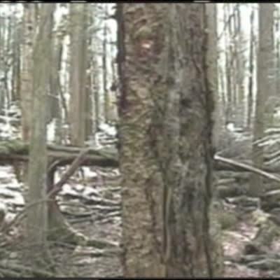 Young man runs into tree three times before finally breaking through it & falling down. Woods. Bonehead.