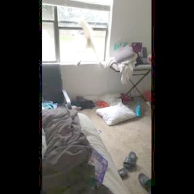 "Demolition Dog" Dog destroyed trash can and many other things. Backpacks, batteries, clothes, hats and a chair. Mess.