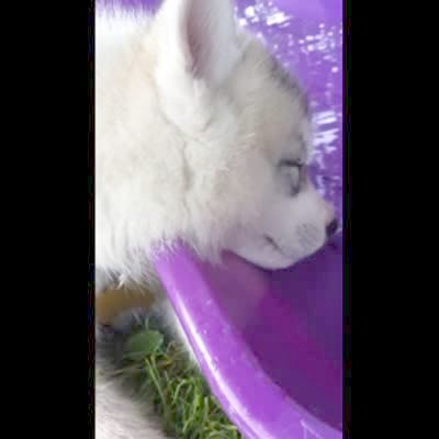 A Husky puppy dog bites at its tail, and falls out of a kiddie pool in the yard.