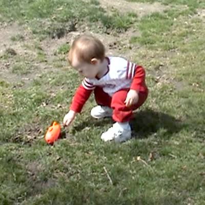 In a backyard, tot boy walks around and picks up toys. Two husky dogs run by and knock him to the ground, hard.