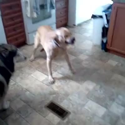 A yellow lab dog sneezes over and over loudly and shakes its head in a kitchen over and over. A husky mix dog stands next to it. Very cute.