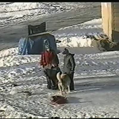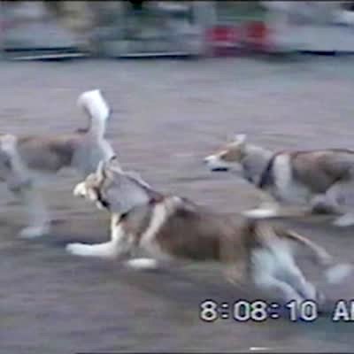 A man carries his tot boy into a fenced in yard, and his German Shepherd runs out of the fence. He puts the boy down in the yard, then the boy opens the gate and lets a Husky dog out while the man chases after the German Shepherd. Security footage.
