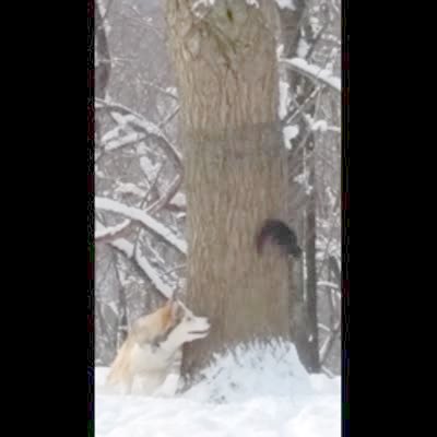 A Husky dog repeatedly chases a squirrel around the base of a tree outdoors.