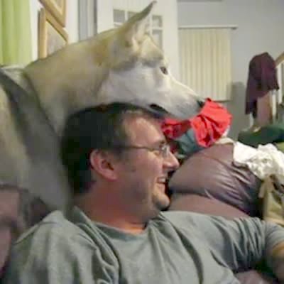 Man sits on couch & husky dog's head is resting on top of man's head. They move their heads together. Funny visual.