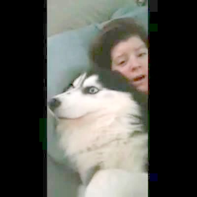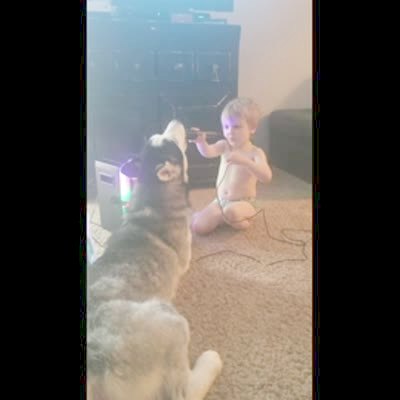 A young boy sings to his husky dog with an electric microphone and his dog howls back. A good one of these.