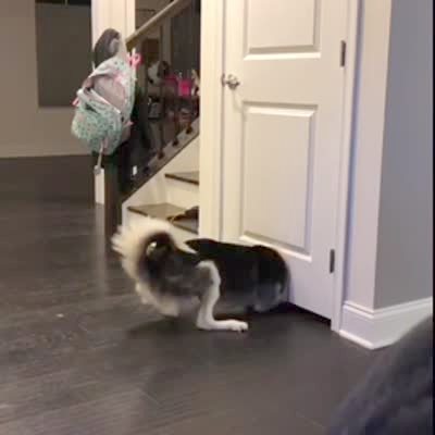 A dog runs down the stairs quickly and barks. He runs outside to a young woman who is home from college. He wags his tail and howls. Graphics. TikTok