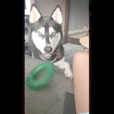 A Husky dog whines at another Husky dog who has a toy that the first Husky dog wants.