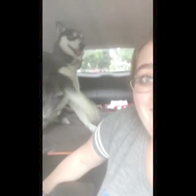 A husky dog whines in the car when a woman lets go of his paw to demonstrate what will happen if she doesn't hold his paw while she drives.