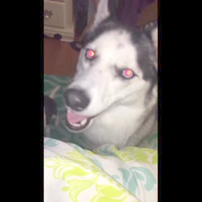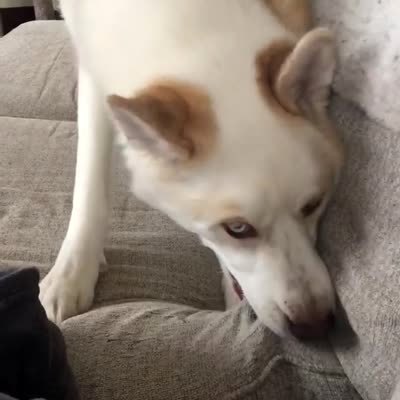 A woman asks a husky dog "who farted" in a living room, and he turns around and sniffs his own butt. Instagram video.