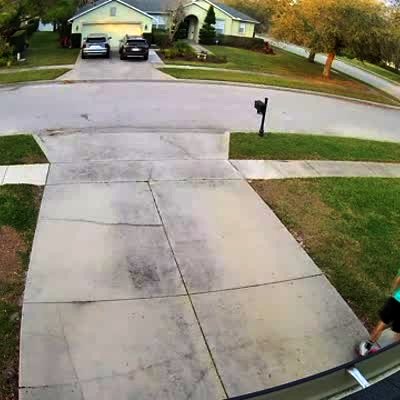A man wipes out on a OneWheel in a driveway while he takes a Husky out for a walk. Security footage.