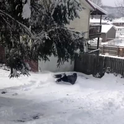 A teen boy prepares to sled outdoors, but a Husky mix dog slides across the ice first. The dog tries to climb back up the hill but keeps sliding down after the boy tries and fails to help it.