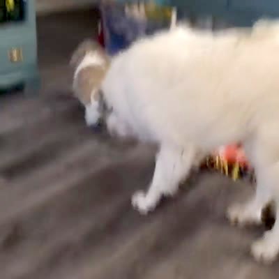 A cute Husky dog eyes a bone placed on the floor indoors and each time the camera looks away and back repeatedly, the dog has gotten several feet closer to the bone before he picks it up and runs away with it. Music plays over the tail of the video.