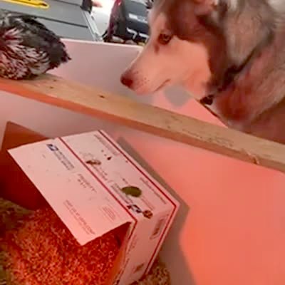 A husky dog sits next to an incubator full of baby chicken birds at home. He then opens his mouth and tries to bite one bird and a woman says that she will spank him.