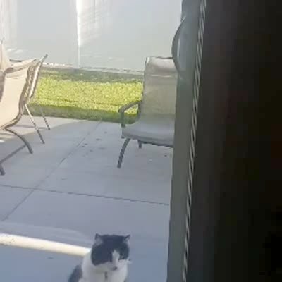 A cat paws at and jumps up, down and around a screen door to get attention. It looks like dancing.