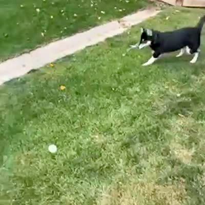 Husky dog chews on a ball. Cat jumps onto a recliner chair to claw at the dog and misses, cat falls to the ground.