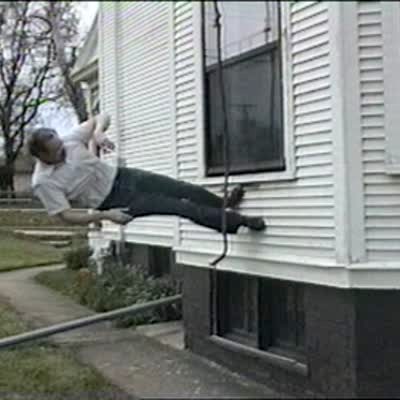Man jumps on mini-trampoline, hits hard, breaks through ceiling.
