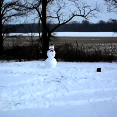 A man shots a snowman to blow him up in the back yard. Action at :40