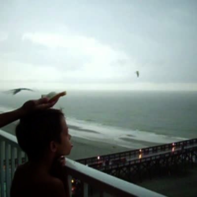 Woman and boy feed seagulls from a balcony. They scream when lightning strikes