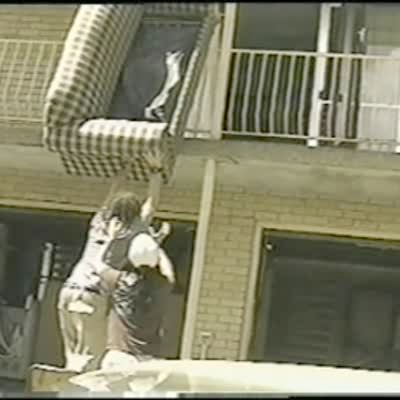 Men try to move couch down from balcony. Man below can't hold up the couch, it falls on top of him. With recovery.