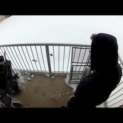 A woman on a balcony tries to open a bottle of champagne with a knife but drops the bottle several stories.