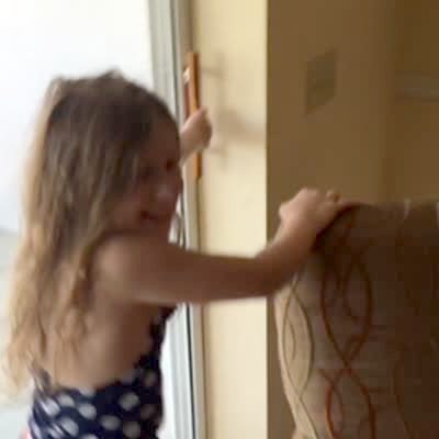 A boy climbs up the sides of a doorway. He jumps up and grabs the side of a living room balcony and tries to swing like Spiderman. He slips and falls hard on the floor. Short tails.