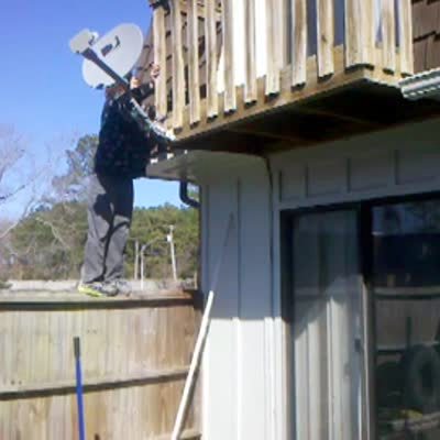 Two men lower a bookshelf from an apartment balcony with a zip line, but it falls off the balcony and breaks when it hits the ground. Short tail