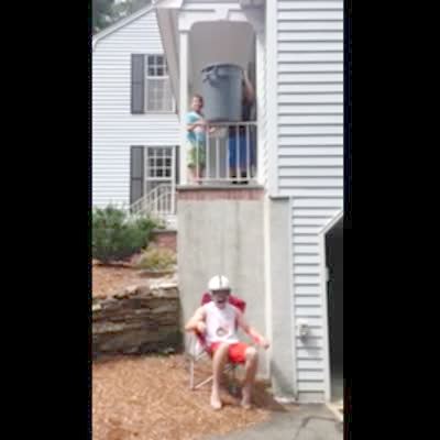 Two boys accidentally drop a trash can bucket full of water onto a teen boy outdoors while trying to pour it on to his head in an Ice Bucket Challenge from a balcony outdoors.
