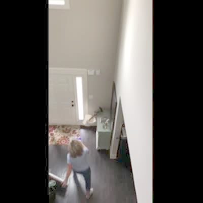 A teen girl throws a tissue off a balcony in the house. She quickly runs down the stairs and catches the tissue before it hits the ground.