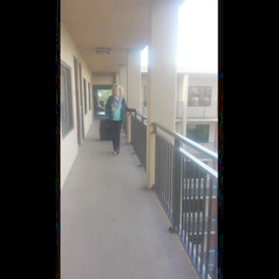 Two women film each other on a hotel balcony. A large gust of wind blows a piece of luggage towards the camera as the luggage spins.