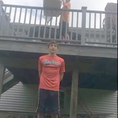 A teen boy does the ice bucket challenge in the yard outdoors. His brother stands on the porch balcony above him and accidentally drops the bucket on his brother below while he talks to the camera. Vine/Instagram